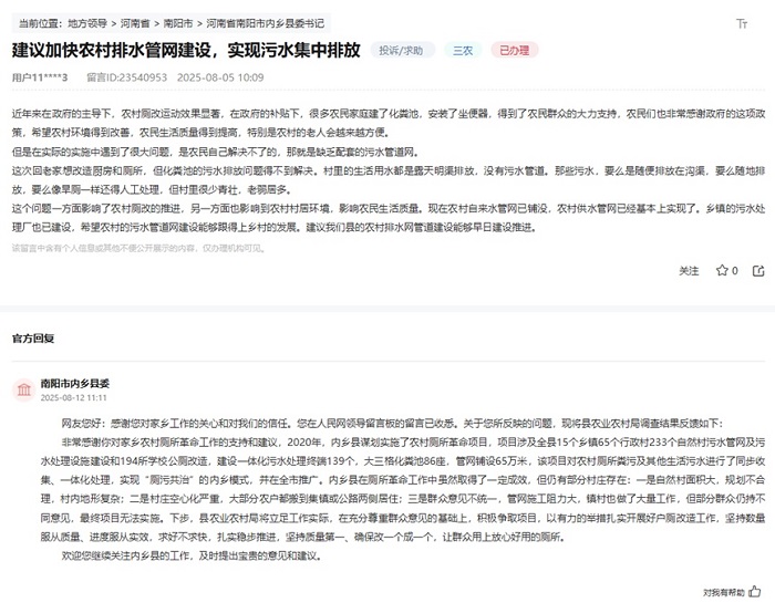 內鄉縣農業農村局在回復中坦言,鄉鎮污水處理廠雖已建成,但管網配套仍是短板?!拔覀冋e極爭取項目,以有力的舉措扎實開展好戶廁改造工作,堅持數量服從質量、進度服從實效,求好不求快,扎實穩步推進,堅持質量第一,確保改一個成一個,讓群眾用上放心好用的廁所。”